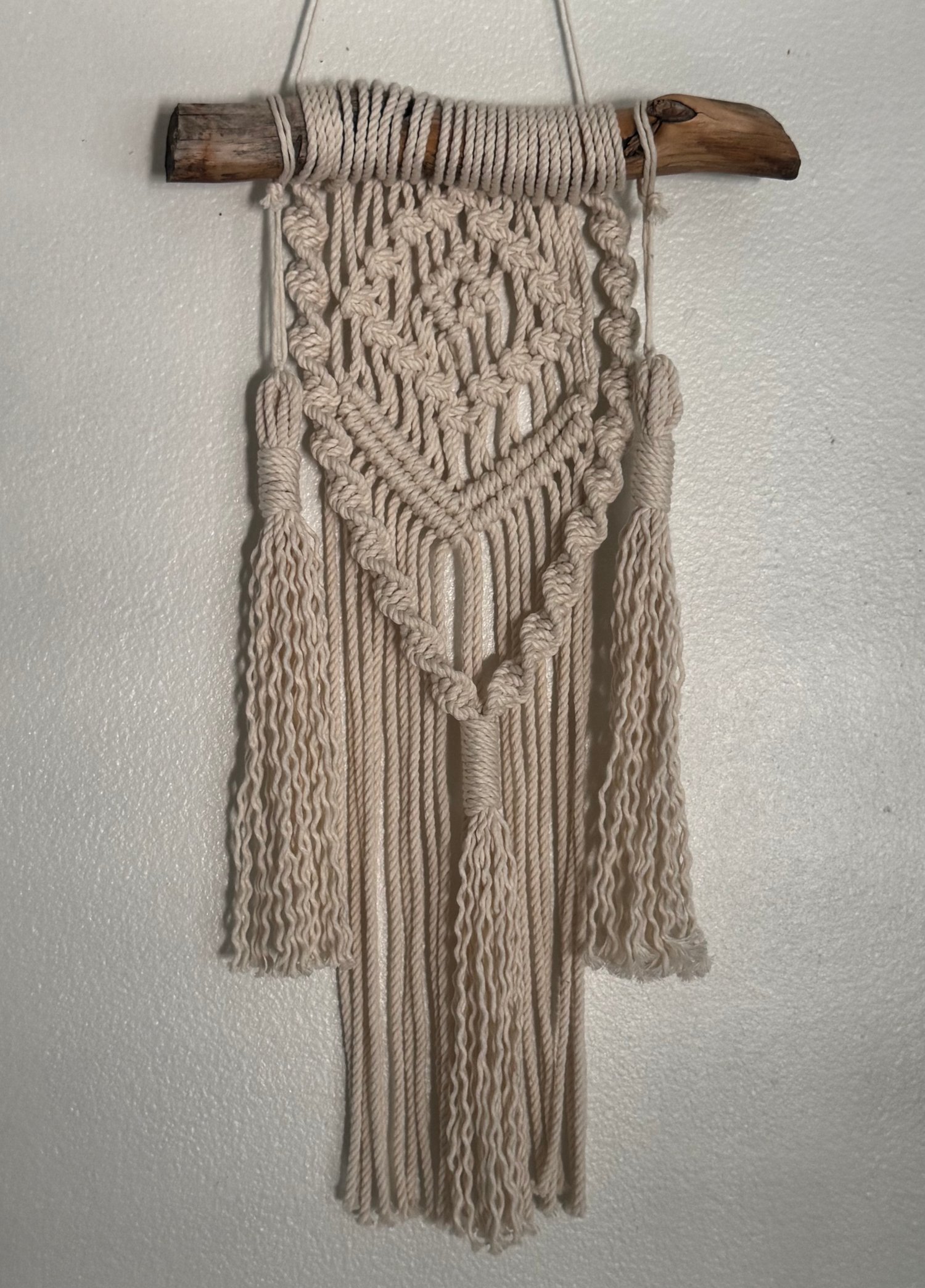 Small handmade macrame wall hanging on a wooden branch, with 2 macrame tassels